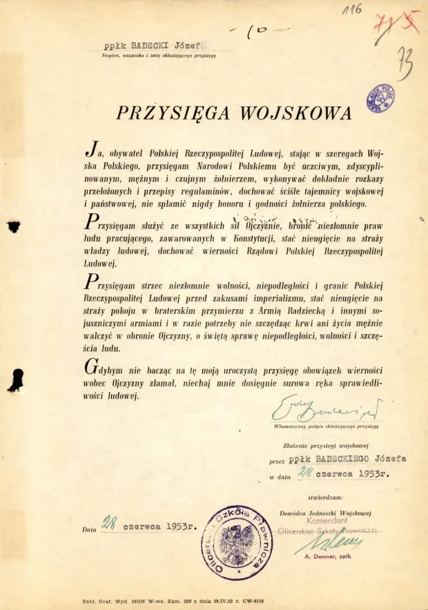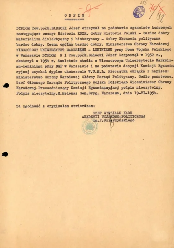 Mjr. BADECKI jest członkiem P.Z.P.R. Oblicze polityczne opiniowanego jest w pełni skrystalizowane, nie nasuwające żadnych zastrzeżeń. Do demokracj Ludowej, sprawy budownictwa socjalizmu oraz do Związku Radzieckiego i państw demokracji ludowej nastawiony jest bardzo pozytywnie.