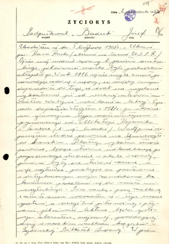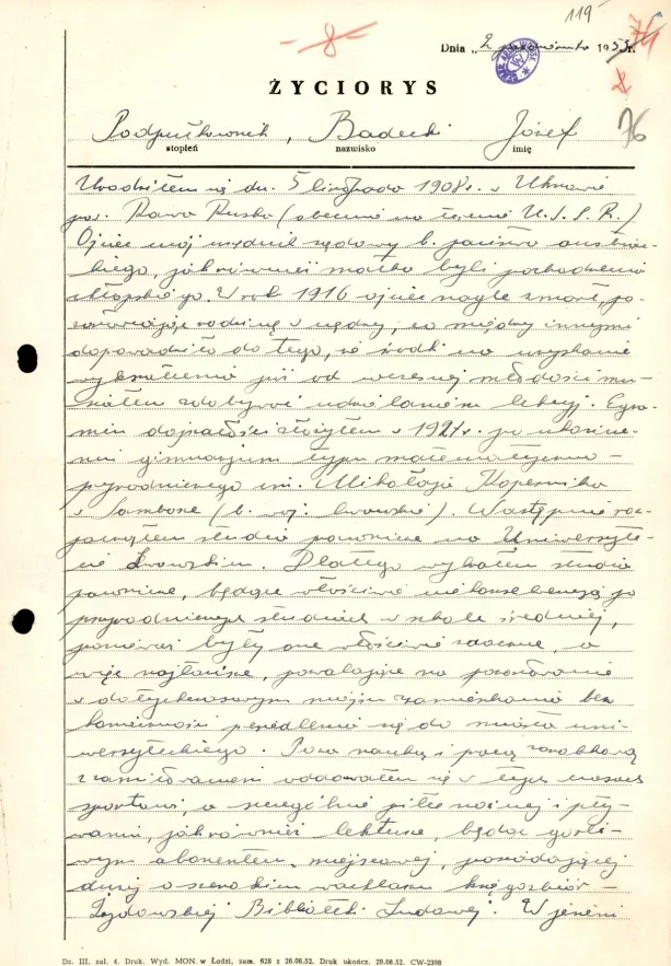 W wypełnianiu swych obowiązków bardzo oboiwiązkowy [sic!], jako żołnierz wybitnie zdyscyplinowany. Jeśli chodzi o poglądy polityczne sędziego J. Badeckiego to […] mogę stwierdzić, że ppor. Badecki w słowach swych i czynach uzewnętrznia się jako szczery demokra[ta], podchodzący do tego rodzaju zagadnień w sposób rzeczowy, realistyczny. W tych warunkach uważam, że sędzia ppor. Józef Badecki […] nadaje się na szefa dużego sądu wojskowego.