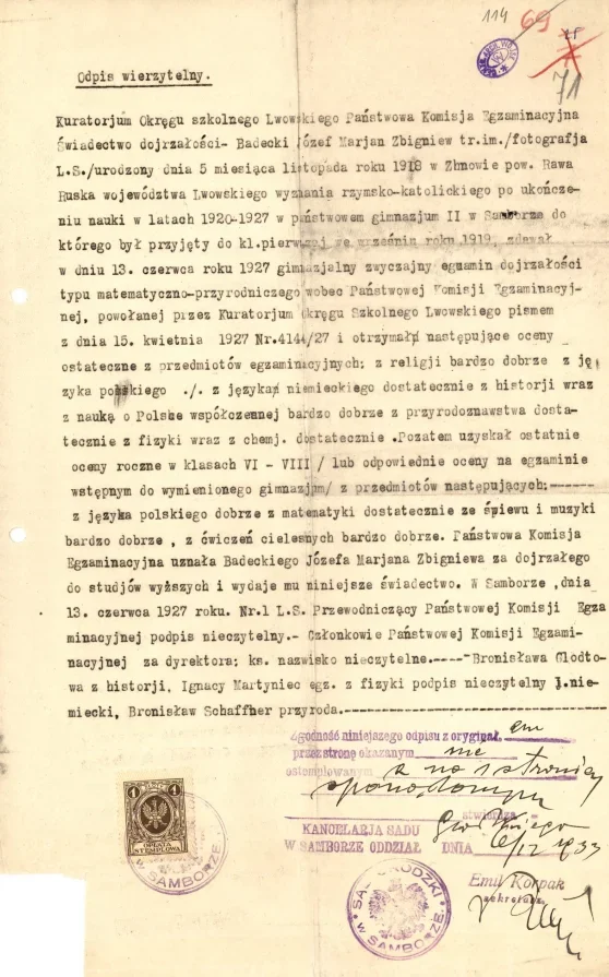 Por. Badecki Józef dał dowody znacznej aktywności i pracowitości, organizując w krótkim czasie Wojsk. Sąd Dyw. mając przy tym do dyspozycji skąpe środki materialne. Jest oficerem taktownym o poważnych wartościach umysłowych i moralnych.