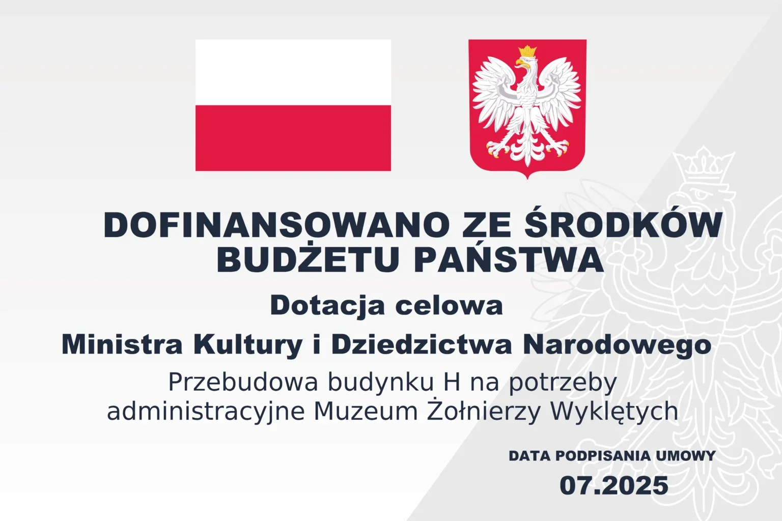 Na podstawie decyzji Ministra Kultury i Dziedzictwa Narodowego z dnia 28 lipca 2025 r. w planie wydatków inwestycyjnych na rok 2025, w dziale 921- Kultura i ochrona dziedzictwa narodowego dla Muzeum Żołnierzy Wyklętych została przyznana dotacja celowa na wydatki inwestycyjne w kwocie 220.000 zł z przeznaczeniem na dokończenie prac projektowych w ramach zadania „Przebudowa budynku H na potrzeby administracyjne Muzeum Żołnierzy Wyklętych”.