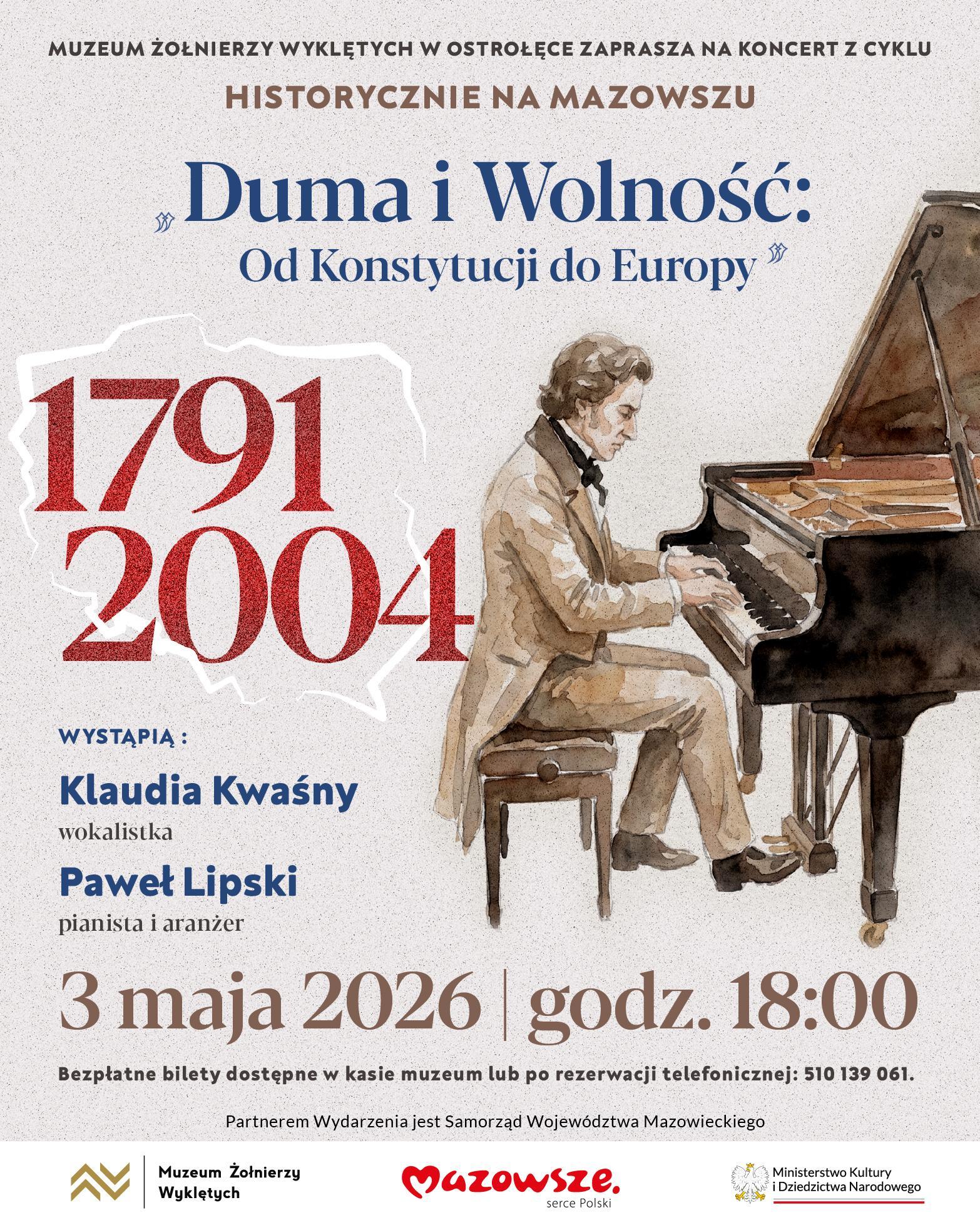 Podczas wydarzenia wystąpią Klaudia Kwaśny – charyzmatyczna wokalistka o niezwykłej wrażliwości oraz Paweł Lipski – uznany pianista i aranżer. W programie znajdą się m.in. perły polskiej muzyki XX wieku oraz utwory patriotyczne nawiązujące do Święta Konstytucji 3 Maja. Koncert będzie nie tylko hołdem dla przeszłości, ale także wyrazem dumy z polskiego dziedzictwa i jego miejsca w kulturze europejskiej.