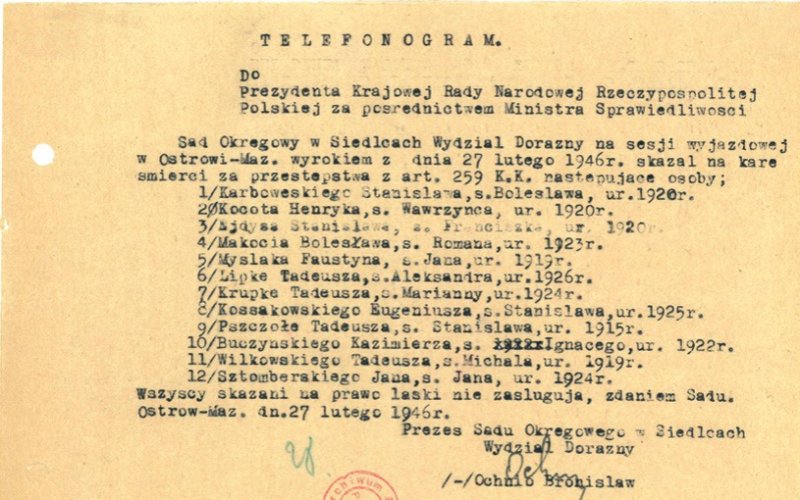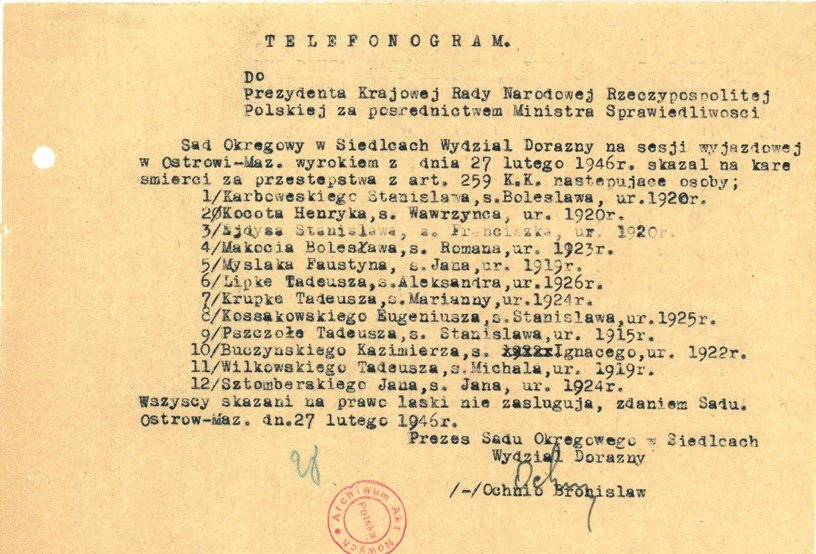 Bronisław Ochnio na najwyższy wymiar kary skazał wówczas Stanisława Sojczyńskiego „Warszyca” (dowódca KWP), Antoniego Bartolika, Ksawerego Błasiaka, Władysława Bobrowskiego, Albina Ciesielskiego, Henryka Glapińskiego, Mariana Knopa oraz Stanisława Żelanowskiego.