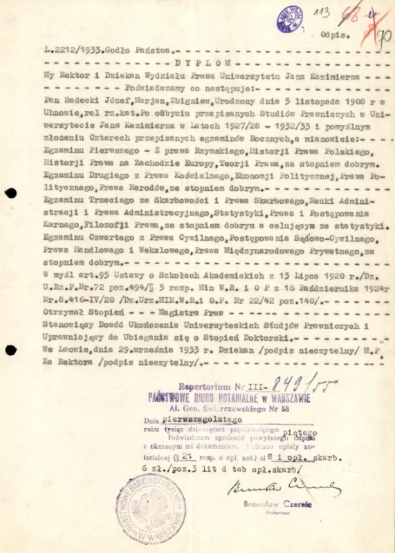 Kapitan BADECKI Józef na stanowisku sędziego wojskowego w Wojskowym Sądzie Rejonowy[m] w Warszawie, stoi całkowicie na wysokości zadania. Poza doskonałym przygotowaniem i doświadczeniem fachowym prawniczym, posiada wysokie poczucie praworządności demokratycznej oraz stosuje właściwą politykę karną w okresie odbudowy Państwa.