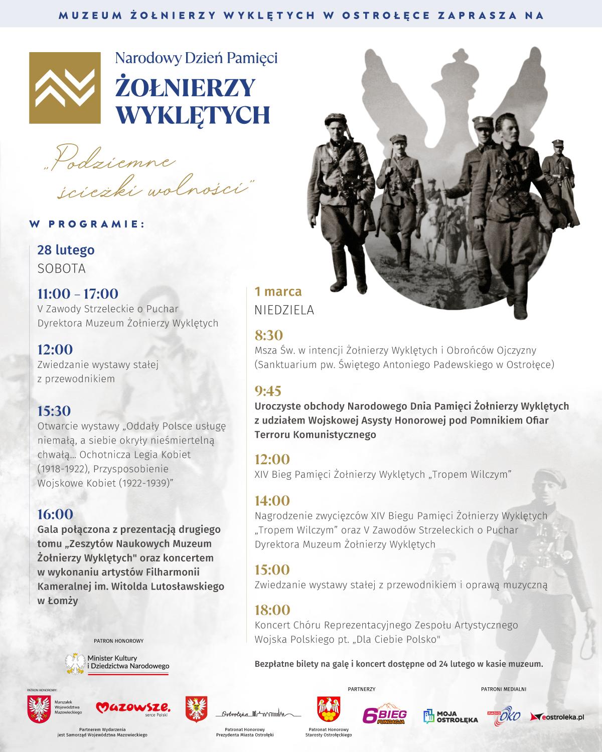 - 16:00 - gala połączona z prezentacją drugiego tomu "Zeszytów Naukowych Muzeum Żołnierzy Wyklętych" oraz koncertem w wykonaniu artystów Filharmonii Kameralnej im. Witolda Lutosławskiego w Łomży.